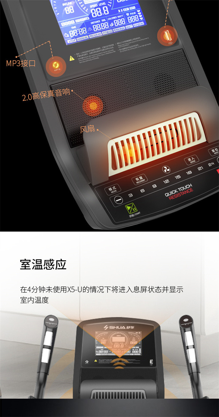 舒華高端跑步機SH-T9100T(V10+)擁有超大高清32寸10點觸控晶屏的工業屏,具有掃碼、刷卡、人臉識別等多種智能登錄方式,方便快捷,并且有在線教學、專業健身模式隨意切換,讓您開啟科學健身。