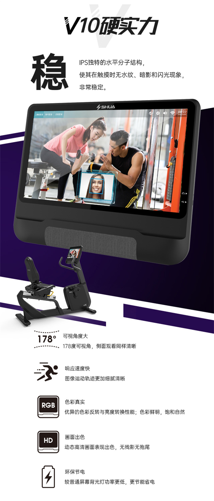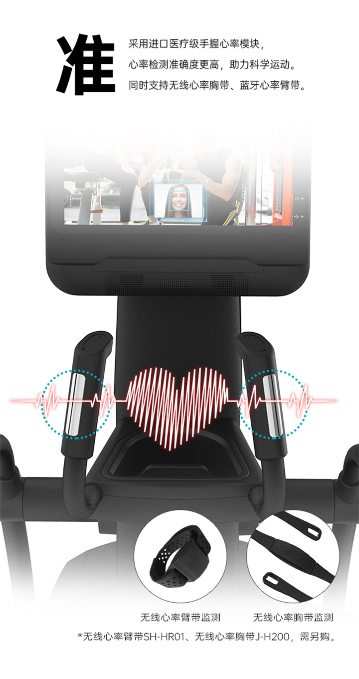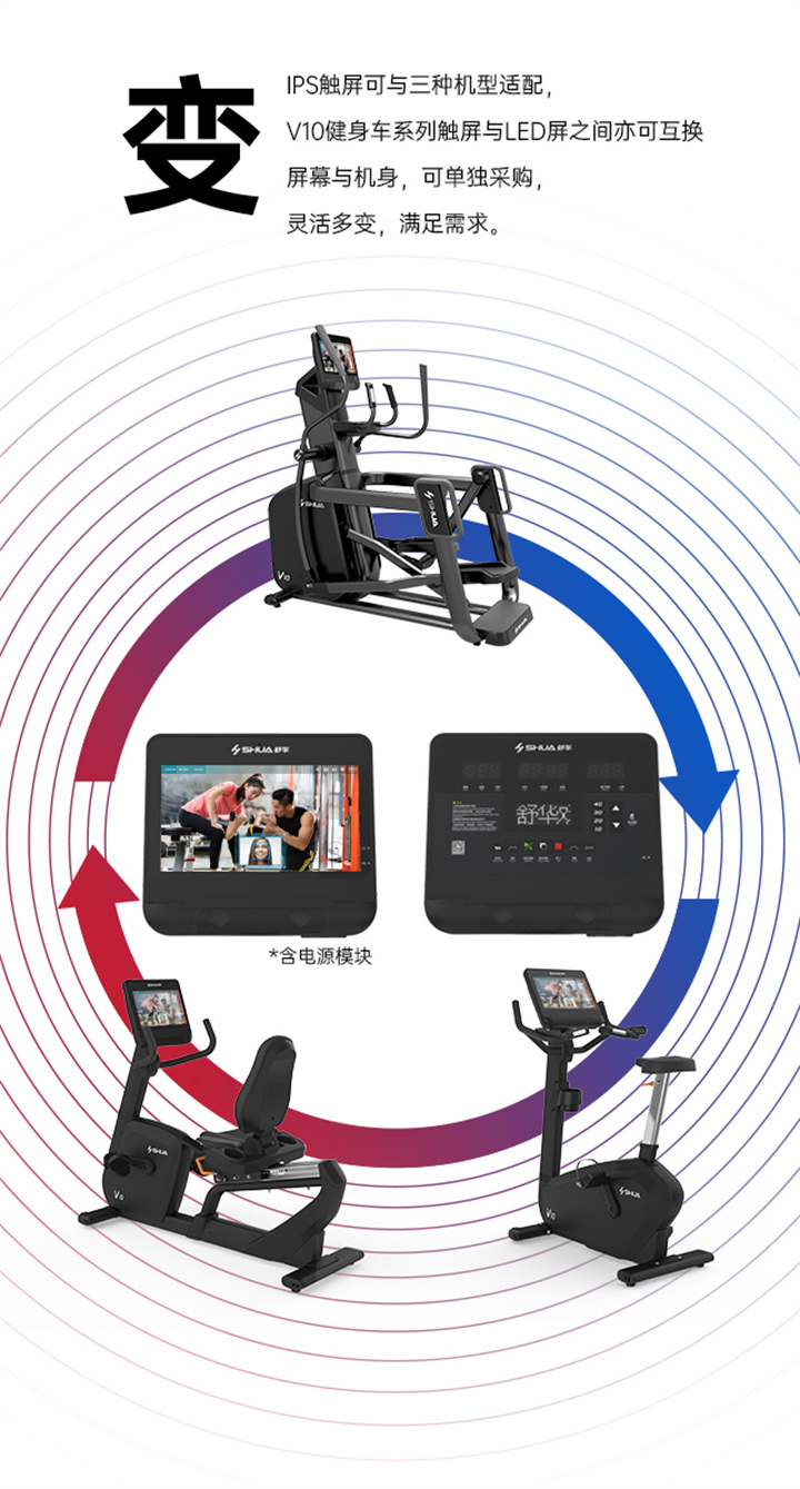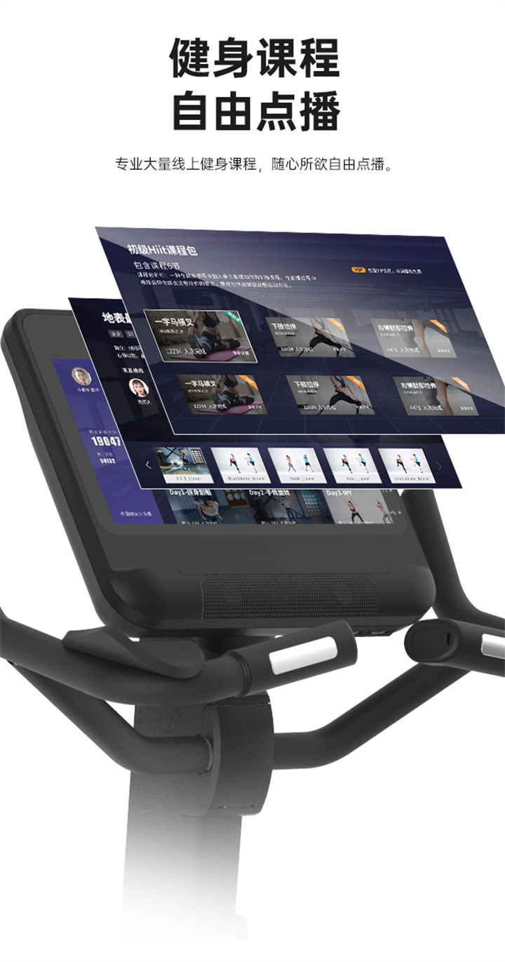 舒華立式商用健身車SH-B9100U(V10)觸屏版擁有超大顯示和操作屏幕, 可以任意設(shè)置阻力、時(shí)間和距離等參數(shù),還可以即時(shí)顯示心跳和轉(zhuǎn)速等數(shù)據(jù),同時(shí),SH-B9100U提供多項(xiàng)科學(xué)運(yùn)動(dòng)處方,更輕松掌握運(yùn)動(dòng)節(jié)奏。