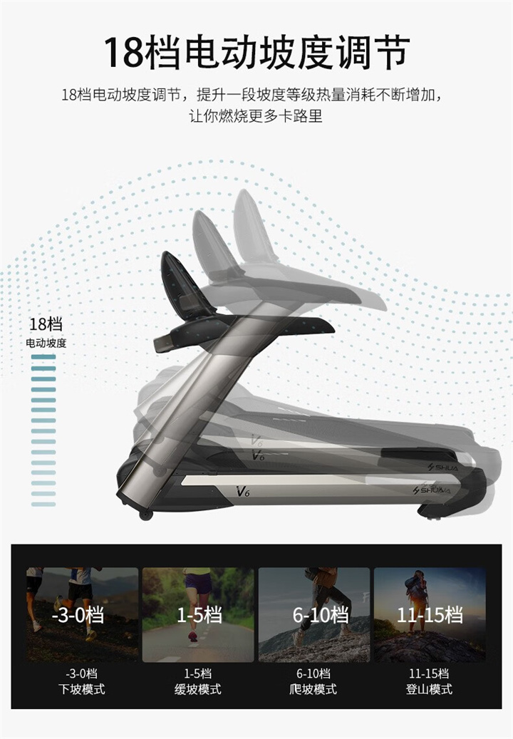舒華商用跑步機SH-T860(V6)采用商用大跑臺,手握心律測試,全跑臺減震護足的設計,對您跑步中的膝蓋進行全方位的呵護,選用手握式感應片測心率等數據,跑步面積達580×1570mm,可承受180kg的使用者使用。