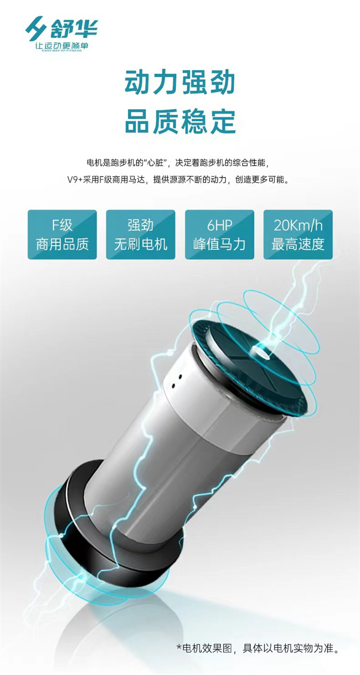 智能商用跑步機SH-T8919T-Y50(V9+)全跑臺減震設(shè)計,跑臺尺寸達580×1570mm,馬達采用3.0CP,配備21.5寸大屏,速度范圍0.8—20km/h,坡度也可以-3—15%,可承受180kg的使用者使用。