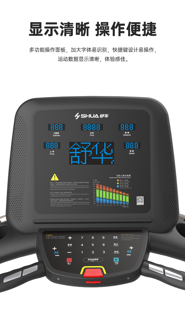 舒華多功能跑步機(jī)T56 SH-T5600-T2跑臺(tái)尺寸是480×1200mm,持續(xù)馬力是DC 1.5CHP(無(wú)刷電機(jī))。